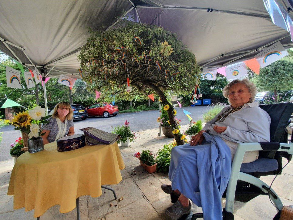 In addition, as Covid-19 is less likely to be caught from being outside the staff teams put up gazebos’ & completed them with the most colourful bunting and decorations. There have been tiny ribbons tied on to trees to celebrate our fight with Covid-19, whenever someone visits as ‘outside visiting’ or ‘window visiting’ they demonstrate we are all still here and in this fight all together.